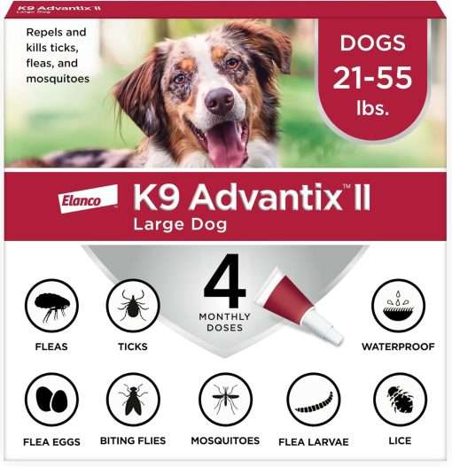 Directions: Application Instructions: 1. Use only on dogs. DO NOT USE ON CATS or other animals. 2. The dog should be standing for easy application. Evenly apply the entire contents of the K9 Advantix® II tube to four to six spots on the top of the back from the shoulder to the base of the tail. 3. At each spot, part the hair until the skin is visible. 4. Place the tip of the tube on the skin and gently squeeze to expel a portion of the solution on the skin. 5. Do not apply an excessive amount of solution at any one spot that could cause some of the solution to run off the side of the dog. 6. Do not get this product in your dog’s eyes, or allow your dog to ingest this product.